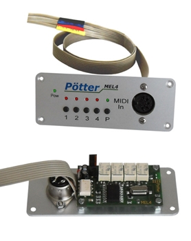 Einbau des MEL4 werden Verstärker mit einem MIDI- Eingang aufgerüstet und lassen sich dann über handelsübliche MIDI- Fußschalter oder über eine PÖTTER Fingertip Anlage ansteuern. Es