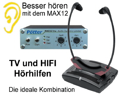 Lautstärkesprünge auftreten, gerade dann wenn eine ruhige Sendung gesehen wird. Eine Kombination, bestehend aus dem Lautstärkebe- grenzer MAX12 Pro und einem Kopfhörer-System verhindert solche Lautstärkeunterschiede.
